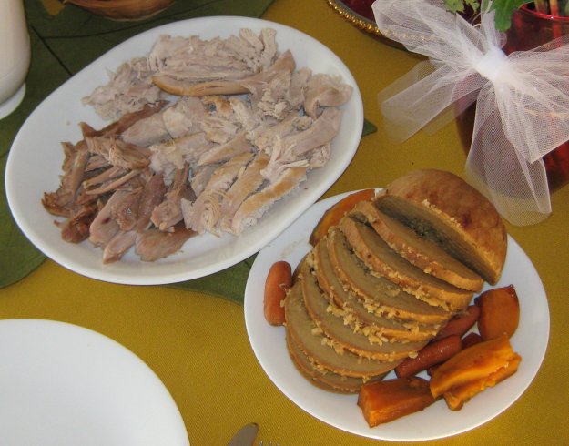 This year we tried Tofurky along with turkey for the thanksgiving meal. While my expectations were low, I have to admit that the Tofurky wasn’t quite as nasty as I had imagined. It is a seitan/soy product textured to resemble meat. Truthfully, in texture it resembles a firm bologna or salami lunchmeat. The package recommends that it be sliced thinly.