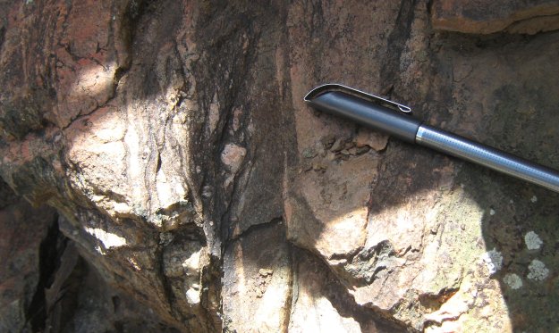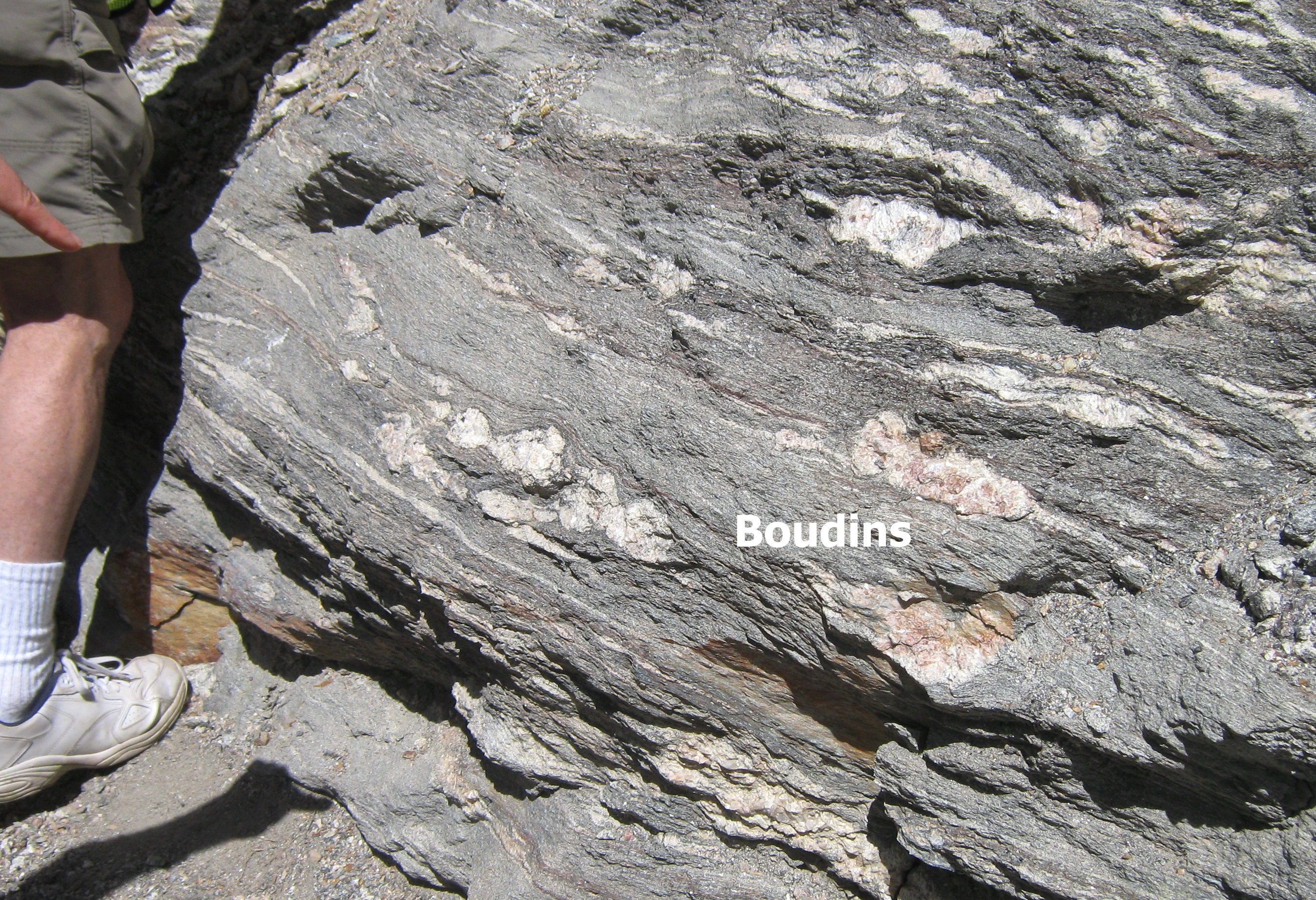 The formation exposed at WP005 was part of a very old structure with multiple faults and igneous intrusions. In the photo above, the edge of the fault is enhanced with a black line drawn in during editing. The surface above the black line is an example of a slickenside, or one surface of the fault. Some members of the trip said they could see slickenlines, but they are so subtle that it is hard to be certain. A large igneous intrusion 100 m away showed signs of dislocation, presumably due to a fault. Boudins were observed at this location and are shown in the photo below.