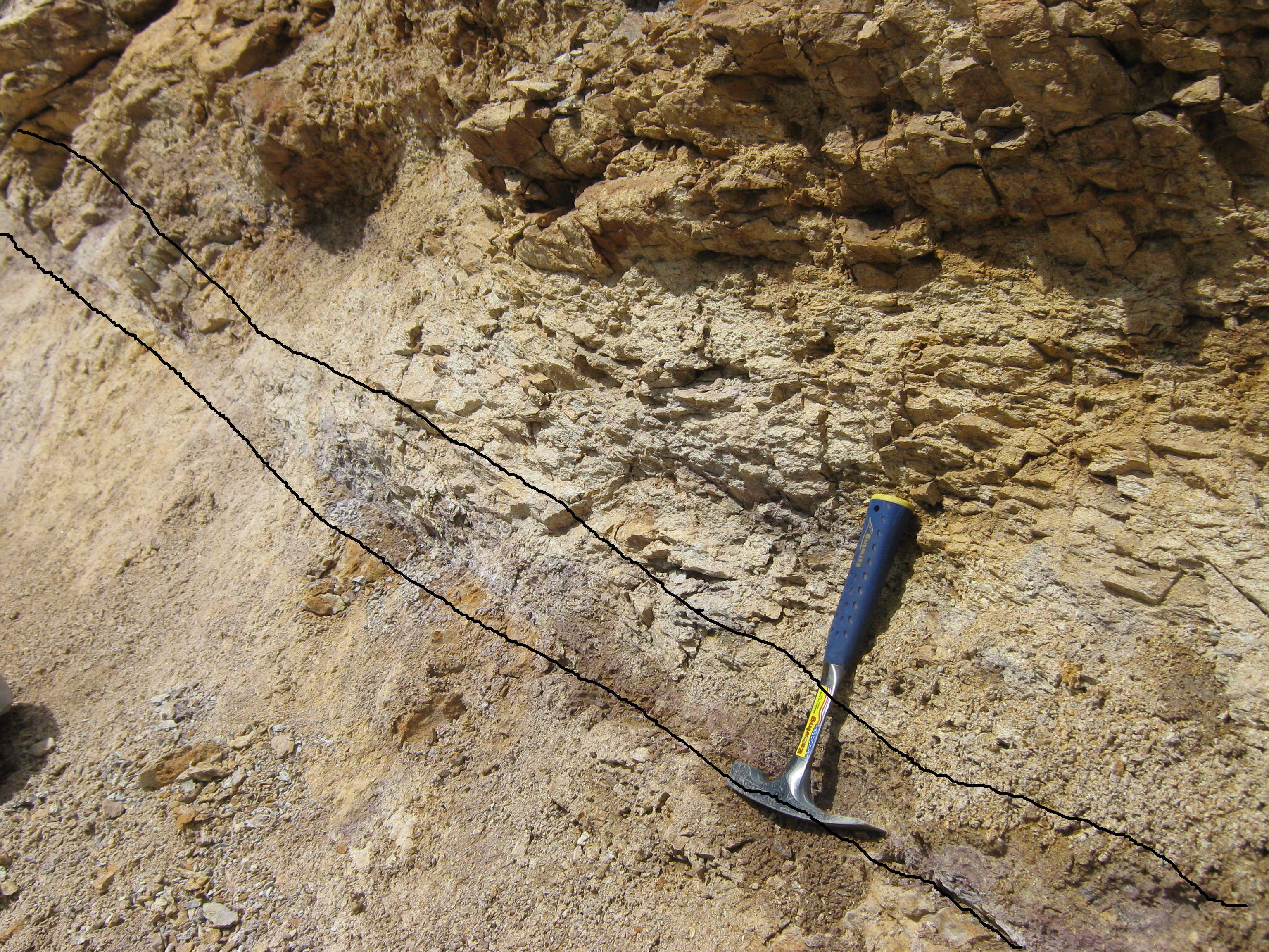 The Junction Ranch fault which had an exposure at waypoint 003 was an example of a fault in a formation that has seen considerable hydrothermal alteration. The orange iron stains on the rock are a clue that fluid transport of minerals has taken place. Calcite veins within the foliated clay filling the fault are an indication that the clay was deposited first. There is no evidence, however, that the fault predates the hydrothermal alteration.