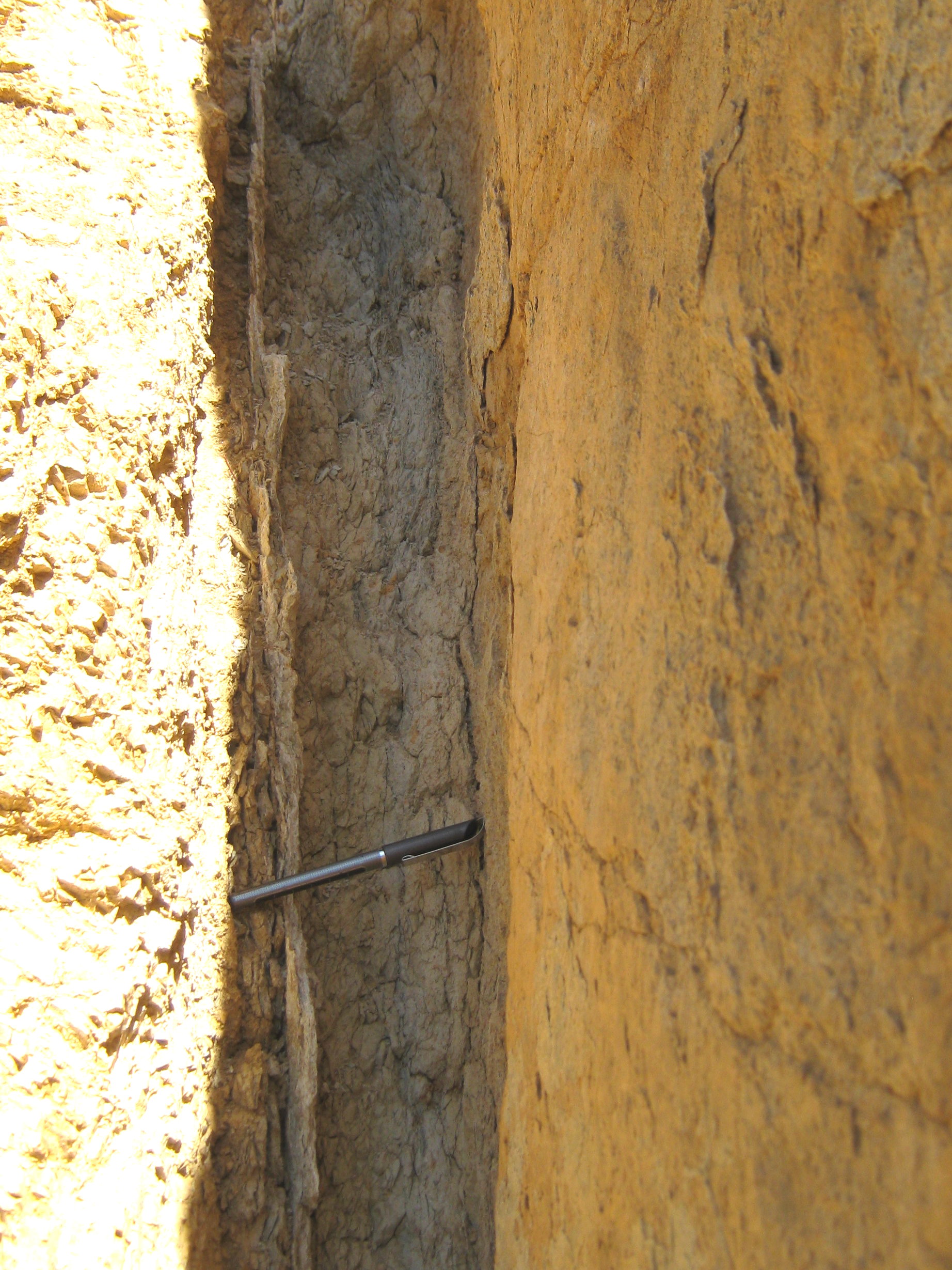 This fault was discovered filled with clay and dips 35 to 45 degrees. It was further exposed by excavation by Caine and another geologist. Again, the approximate boundary of the fault was enhanced with black lines in editing. There was considerable alteration of the rock on the hanging face side of the fault with iron staining associated with hydrothermal alteration.