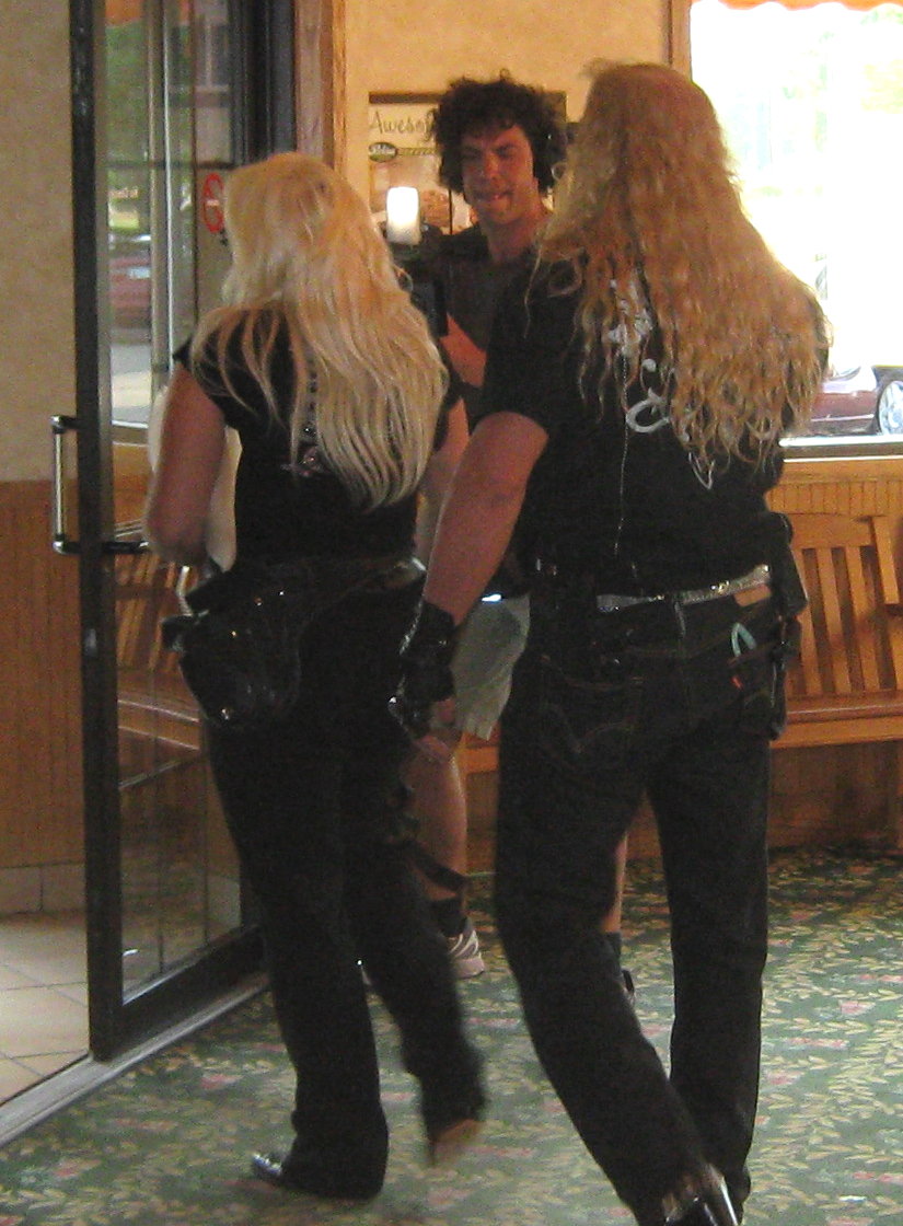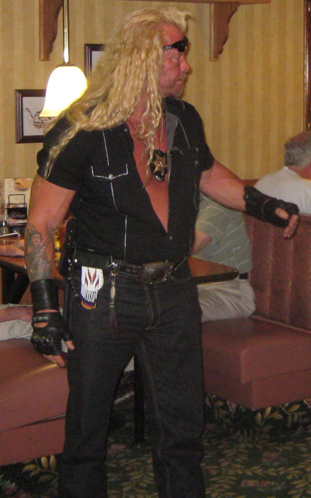 We arrived at a Perkins restaurant to rustle up some grub this evening and had an encounter with reality television. The characters from the cable television show “Dog the Bounty Hunter” were filming inside the restaurant. Dog is actually named Duane Lee Chapman and has quite a colorful history. He was born in Denver, CO, in 1953. According to Wikipedia he did 18 months of prison in Huntsville, TX. He belonged to the Devils Diciples at one point and worked as a bail bondsman. Between all of the wives, he has ca 12 kids.