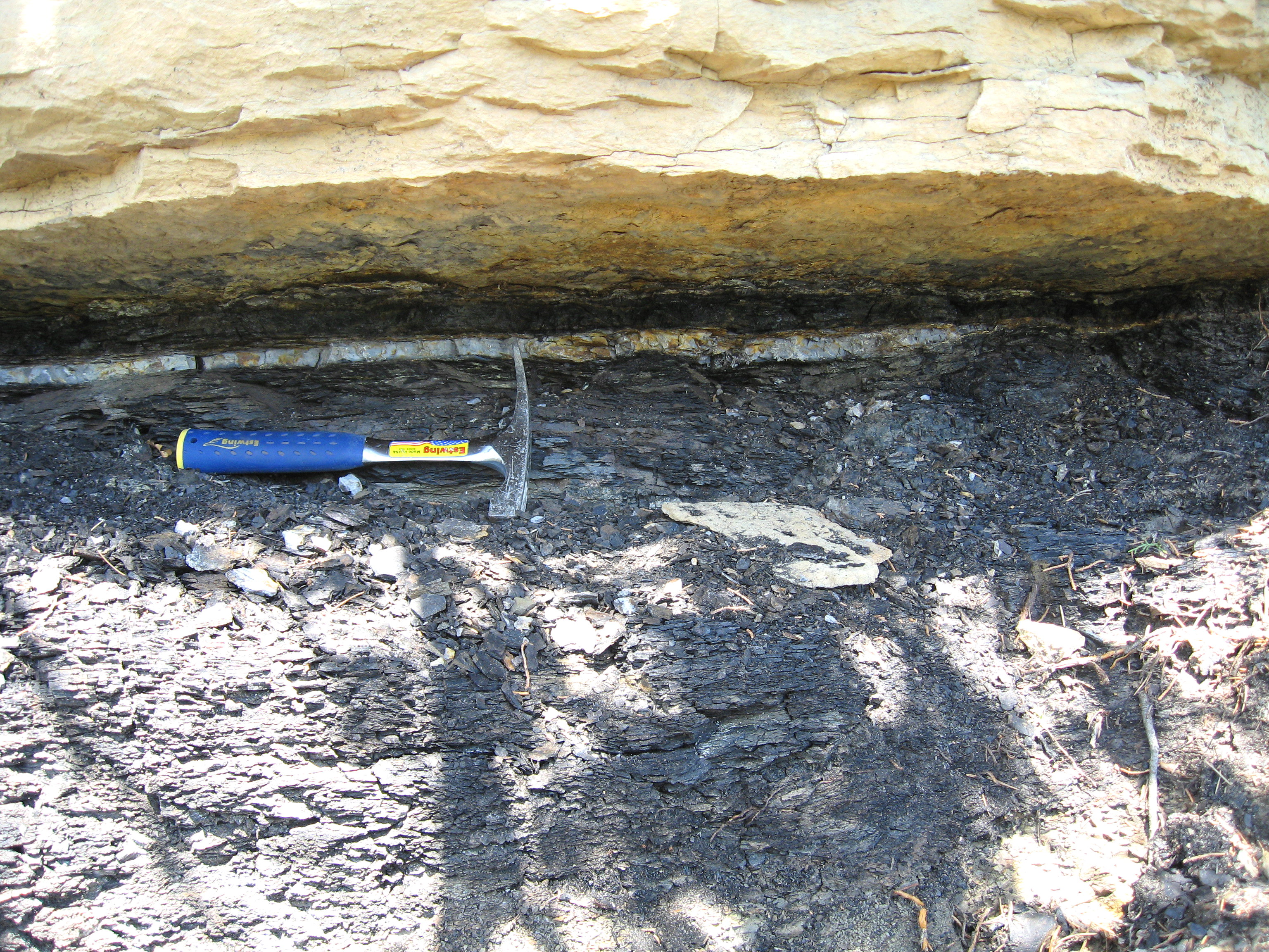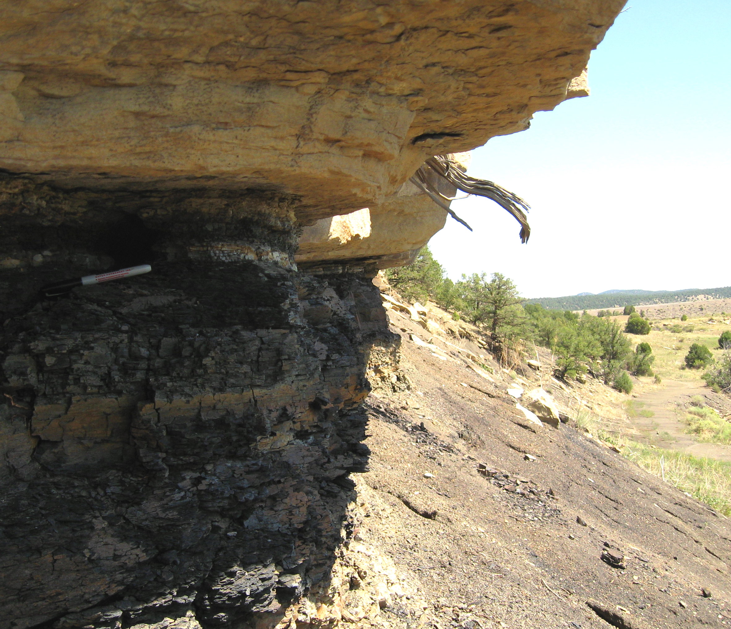 View of the K-T Boundary sitting under a cap of sandstone. Note Sharpie marker just below layer.