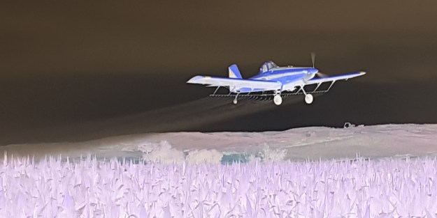 I get to enjoy a commute through farm country every work day. It is my habit to pull over and watch the crop dusters when they’re out. I’m secretly jealous of them as they zoom with their wheels just above the crop in a powerful turboprop aircraft. In the fall of 2017 I caught this fellow spraying what I estimate is an antifungal onto a corn crop near the end of the growing season. The negative image seemed more interesting than the positive.