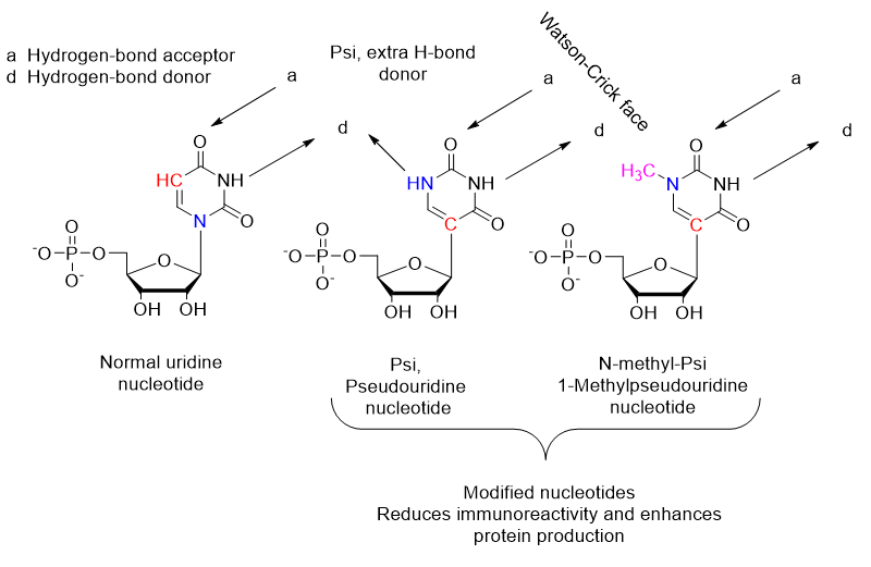 In general, if you can change the shape of a molecule, particularly with peptide or nucleotide polymer molecules, you will change the physical properties and the reactivity properties. The Psi nucleotide adds another hydrogen bonding group into the mRNA. These changes add up to lowering the immune response to the vaccine.