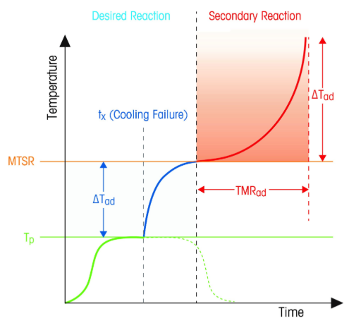 Thermal process safety refers to safe operation of chemical manufacturing in regard to the generation of heat in a reaction mass and the hazards arising therein. The hazards from uncontrolled self-heating include acceleration of reaction kinetics producing accelerating heat and pressure evolution. If the reaction enthalpy and subsequent temperature rise theoretically exceeds the boiling point of the solvent despite the cooling jacket and the chilled condenser, then self-heating can lead to a boil up and uncontrolled ejection of the reaction mass. With insufficient cooling, the temperature will rise to the solvent bp and boil off the solvent first, carrying much heat away as heat of evaporation. Once most of the solvent has boiled away and if the reaction mass continues to self-heat, the temperature will continue to rise and peak at some undesired level as the reactants are consumed. Further heating of the now hot, highly concentrated reaction mass, potentially leading to successive reactions that may or may not be exothermic.