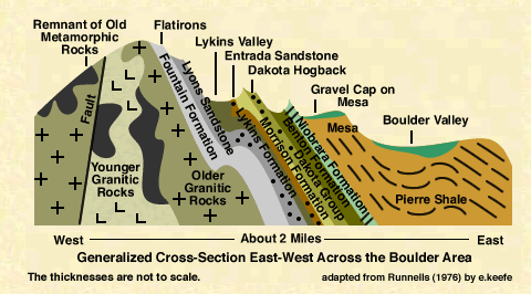 Source: Cross sectional sketch of the stratographic geology the basement rock protruding upward through the layers of sediment pushed upwards by the Laramide Orogeny. This represents the formations adjacent to Boulder, CO. Excerpted from “Boulder, A Sight to Behold: Guidebook” (1976) by Donald D. Runnells, modified by Sheila Murphy