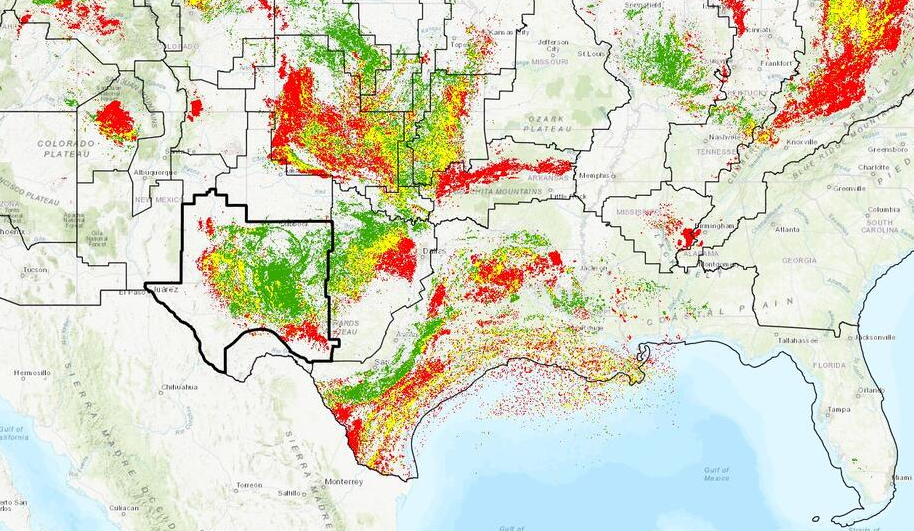 Source: USGS. Red is gas and green is crude oil. The dark outline is the Permian Basin area.