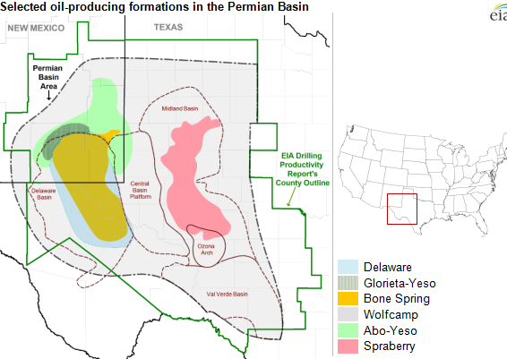 In the above USGS map the perimeter of the Permian Basin is shown as the heavy black line. The Permian Basin is up to 25,000 ft thick and is a sedimentary formation that dips to the eastward.