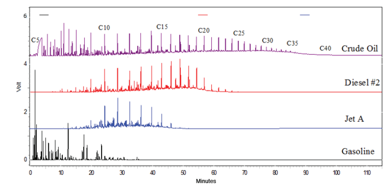 A stack of gas chromatograms showing the components of crude oil and several derived products below it. Each peak indicates a single component with the intensity along the y-axis and time in minutes along the x-axis. The area under each peak is proportional to the % composition in the sample. On the left side of the chromatogram are the components that are more volatile and exit the GC column earliest. The right side shows the components that exited the column after longer intervals. They are the longer chain molecules. Source: IRTC.
