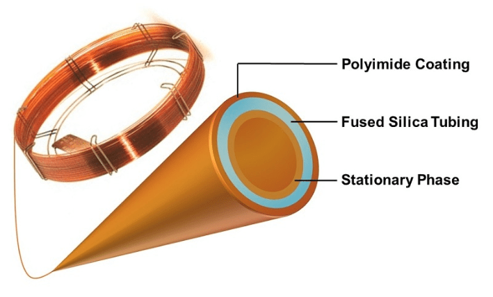 The inside surface of the long capillary column can be just fused silica or it can have a coating. In any case, the components of the sample each have a different affinity for the inner wall of the capillary. As the carrier gas pushes the vaporized sample components along, the components with the least affinity for the inner column surface advance through the column fastest and arrive at the detector earlier. Generally, the higher the molecular weight, the lower the volatility and the longer it takes to exit the column.