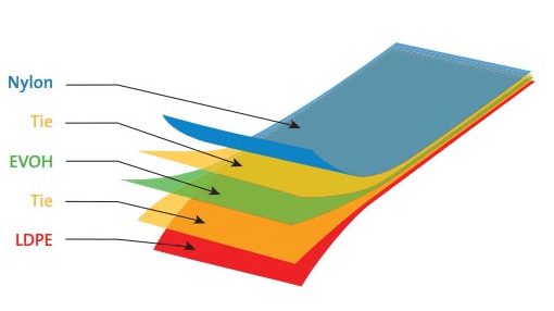 Source: Technical Bulletin, Saint Gobain. Multilayer film structure with 3 different films and two tie layers between them. The Nylon layer provides toughness and tear resistance. The polyethylenevinyl alcohol (ethylene-vinyl chloride copolymer) layer (EVOH) blocks the transmission of oxygen and carbon dioxide. Low density polyethylene (LDPE) layer provides broad chemical compatibility along with biocompatibility for safe handling of biopharmaceuticals. Not all polymers are compatible with melt bonding. The tie-layer is a melt-bondable adhesive polymer film that hold the layers of polymer into a single film. The tie layer polymer is often a polyethylene film that has a surface layer of organic acid or anhydride groups that can bind to other polymers by melt bonding.