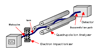 At the terminus of the capillary column is the detector. There are a variety of methods used to detect sample and send a signal to the plotter or computer. A particularly useful type of GC system uses a mass spectrometer as a detector. The flow of components enters an ionization chamber and positive ions are generated by electron impact and sent through the mass analyzer and on to the detector. This is occurring continuously as the sample components exit the column. As the components are detected, a regular chromatogram is collected and displayed. The difference with the mass spec detector is that along the timeline, mass spectra are also collected. It is possible to select any given peak in the chromatogram and display the mass spectrum.