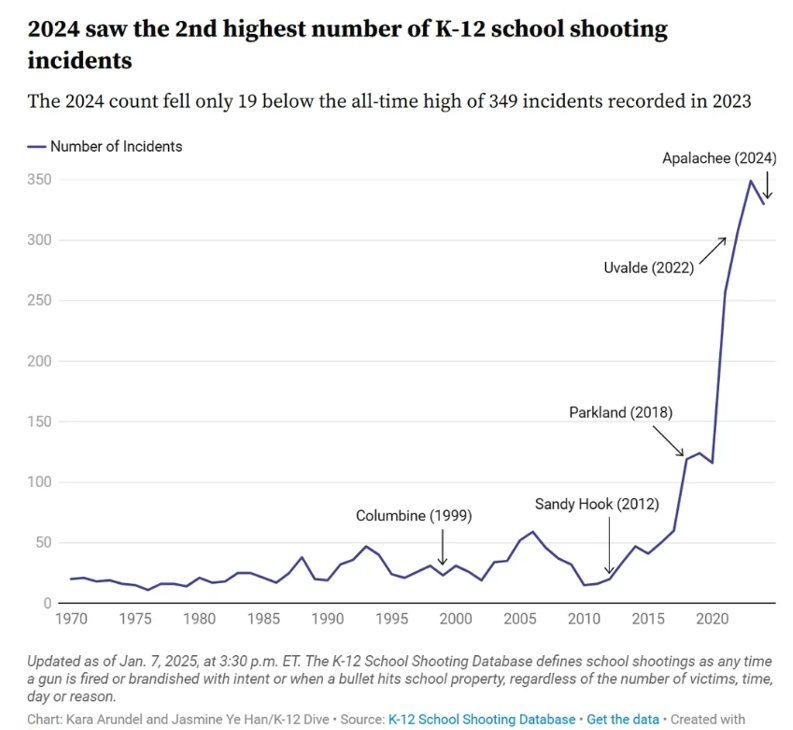 Below is a graphic from the K-12 Shooting Database. Of course, in the USA K-12 refers to the 13 years of basic education all children receive in public and private schools.