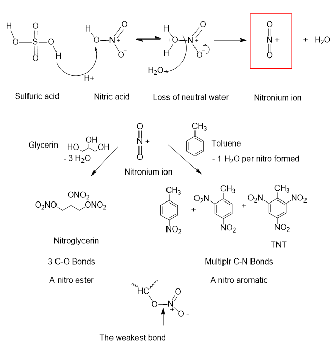 A quote from Wikipedia “The nitration of glycerin in 1846 by Ascanio Sobrero. He initially called it ‘pyroglycerine‘, and warned vigorously against its use. In fact, he was so frightened by what he created that he kept it a secret for over a year” (Wikipedia). Nitroglycerin is a nitrate ester wherein the three carbon atoms of glycerin are connected to the nitrogen through an oxygen atom. while TNT is a nitro compound with the nitrogen is connected to carbon atoms of toluene. The great sensitivity of nitroglycerin lies in the C-O-N connections while TNT and picric acid have C-N connections. Nitroglycerin is classified as a “nitro ester” while TNT and picric acid are “nitro aromatics.” The nitro ester functionality is much more susceptible to rapid disassembly by a stimulus like mechanical shock or heat.