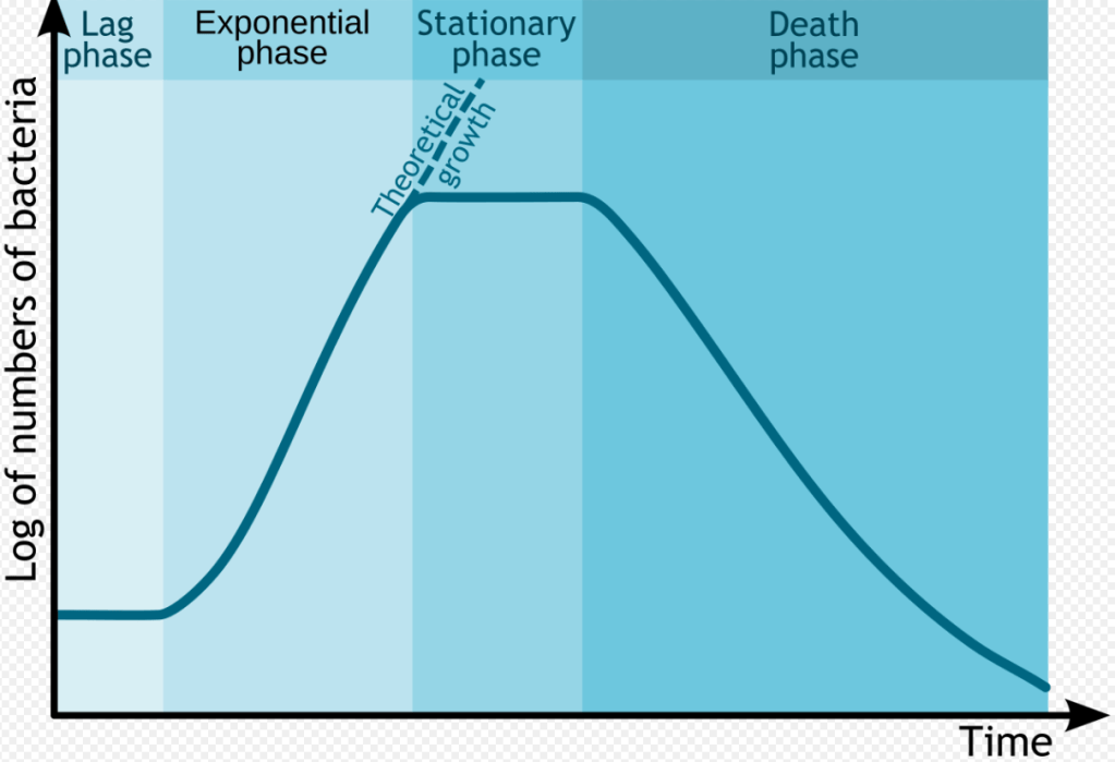 The aging of products by purely chemical transformations is quite different from microbial aging. Microbial aging involves uncontrolled, but self-limiting, growth rates of the microorganisms which follow an s-curve. The s-curve shows that microbial aging begins slowly but soon enters the “log phase” characterized by exponential population growth. The log phase doesn’t last forever, though. Soon population growth levels off as nutrients are consumed and general growth conditions deteriorate. The loss of further nutrients leads to eventual death of the colony.