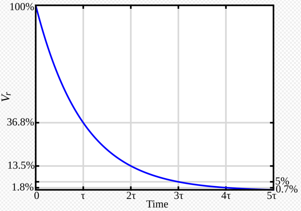 The decay of an isolated electrostatic charge follows an exponential curve according to a time constant. How many time constant periods must one wait for the static charge to decay to a safe level or near zero? The answer I’ve read for electrostatic charge is 5-time constants, tau τ. As can be seen below, 5τ time periods takes you down to within 0.7 % of the theoretical result.