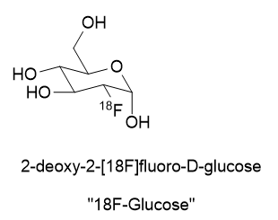 18F has replaced the oxygen (OH) group at position 2 of glucose, thus the prefix “2-deoxy-2-[18F]fluoro-“