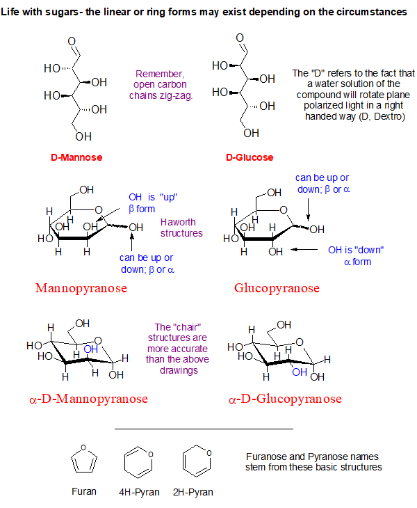 Look at the blue O-H groups on the ฮฑ-D-Mannopyranose and compare it to the ฮฑ-D-Glucopyranose shown above. See how they are hanging on the ring? One is directed up and the other is pointing outward and down a bit. This simple inversion in orientation produces the chemical difference between the two sugars making them distinctly different chemical substances.
