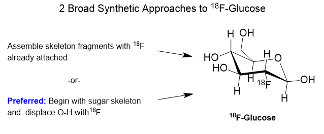 In chemical synthesis there is usually more than one possible strategy for getting to a target molecule. In the case of 18F-glucose, whatever pathway we choose must be rapid and efficient owing to the very short half-life of the 18F. The preparation must be done in as few half-lives as possible.