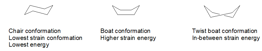 Source: Gaussling. Shapes that cyclic, 6-carbon rings can take. In reality, the rings flip back and forth across the different conformations, but they tend to spend the most time in the lowest ring strain shape which is the chair.