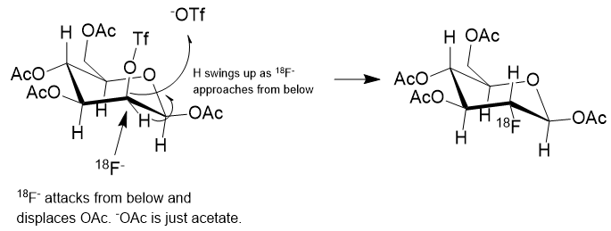 The general strategy for the nucleophilic substitution synthesis of 18F-glucose is this: Protect all of the hydroxyl groups of D-Mannopyranose as an acetate except for one which serves as a “leaving group“. This leaving group is called a trifluoromethanesulfonate, or just “triflate“. This triflate is then displaced by 18Fluoride anion by an SN2 substitution. In plain English, 18Fluoride anion forms a C-F bond as the triflate anion is breaking its C-O bond in a process called nucleophilic substitution.