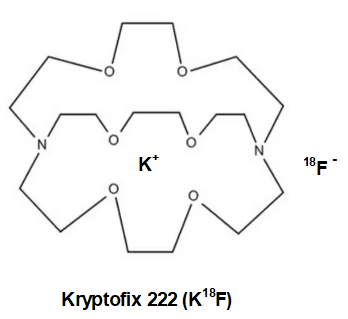 While much of the time K+ is sufficiently non-interfering, but as happens occasionally the fluoride anion tends to bind to the potassium cation a bit too tightly. This can substantially slow the rate of transfer of 18F anion to the carbon of the sugar ring. To get around this, either the potassium must be replaced with another more charge diffuse cation like tetrabutylammonium+ or cesium+, the K+ can be “wrapped” in a protective organic “jacket or shield” that will prevent the K+ and the 18F– ions from getting too close to one another and bound too tightly. We would call the protected K+ a non-interfering or charge diffuse cation.