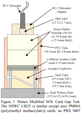 The card gap test, Konen test, and time-pressure test will give a good picture of explosive behavior. The Konen test indicates whether or not extreme heating can cause an explosion sufficient to fragment a container with a small hole in it.