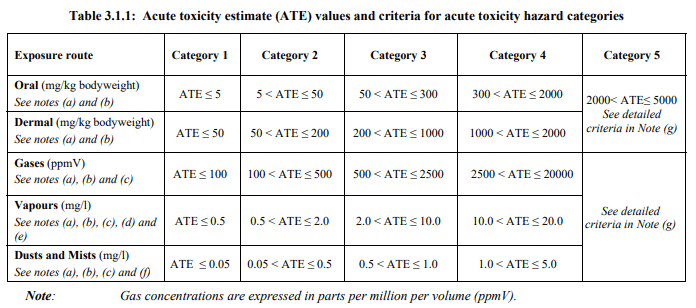 An SDS uses signal words like “Caution”, Warning”, or “Danger”. A particular standard test is needed to narrow down the type and magnitude of the toxicity. The figure below from the GHS shows the thresholds for categorization of Acute Toxicity.