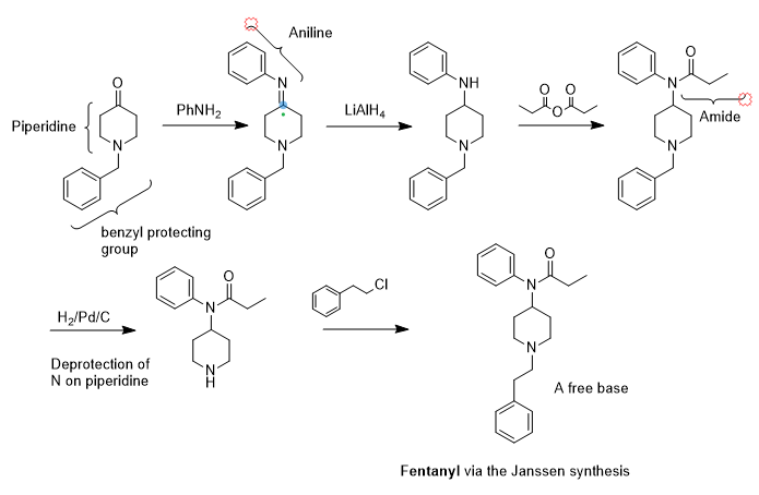 So, how is fentanyl synthesized? See the synthetic scheme above. I’ll just comment on the Janssen synthesis and some issues. I have no idea of how it is made out in there by the Mexican cartels and in ramshackle American trailer parks. The synthesis above has some steps that may be undesirable for backwoods or jungle operations like hydrogenation. In the first step, aniline will be needed to make the phenyl imine. It’s pretty toxic and stinks to high heaven. Next, lithium aluminum hydride is needed to reduce the imine double bond to an amine. This innocent looking grey powder is very hazardous and should only be used by an experienced chemist. It is also available as a solution in tetrahydrofuran. The next step is the formation of the amide with propionic anhydride. While the reaction entails a simple reflux, you still have to isolate the product. Once you have recovered the amide, the benzyl protecting group on the piperidine nitrogen must be removed. It allowed amide formation exclusively on the upper aniline nitrogen and has served its purpose. Finally, the piperidine nitrogen must be festooned with a phenylethyl group and phenylethyl chloride was used to afford the fentanyl product.