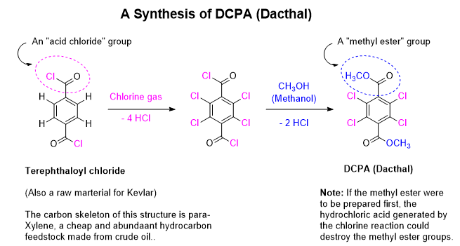 The industrial manufacture of DCPA is neither complicated nor difficult. The terephthaloyl chloride (pronounced: terra THAL oh illchloride, soft TH as in “thing”) raw material is used in the manufacture of Kevlar and is readily made in several ways. Whether or not the DCPA manufacturer makes their own or outsources it is not available information. In either case, the terephthaloyl chloride is chlorinated to exhaustion (fully chlorinated) and then the methyl ester is prepared by contacting the chloride with methanol to form the diester (pronounced: DYE ester).