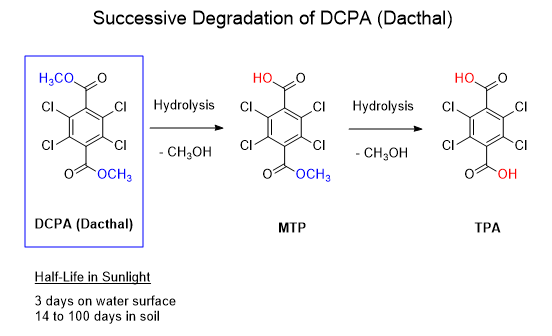 As useful of an herbicide as it may be, it has a dark side that spooked the US EPA into issuing an unusual emergency suspension on August 6, 2024. In particular is the potential toxicity to the unborn and the risk to “post-application workers involved in tasks such as transplanting, weeding and harvesting.” Female farmworkers are at high risk since DCPA has been shown to be toxic to the fetus producing lifelong health problems. The reader is invited to read the link for details in the toxicology. The successive degradation of DCPA is shown below. In addition to hydrolysis, it is also subject to photodegradation in sunlight.