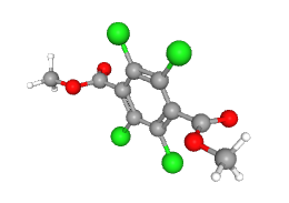 Graphic and physicochemical data. PubChem. DCPA structure tilted just a bit for clarity. Octanol/water partition coefficient: log KOW = 4.40 @ 25 °C, water solubility = 0.5 mg/l @ 25 °C, Vapor pressure: 2.5 x 10-6 mm Hg at 25 °C