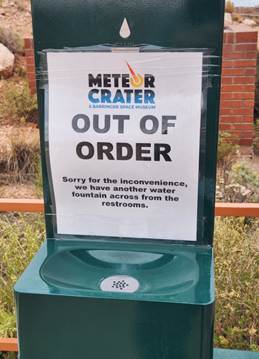 At first glance the sign seems to say that the Meteor Crater is out of order.