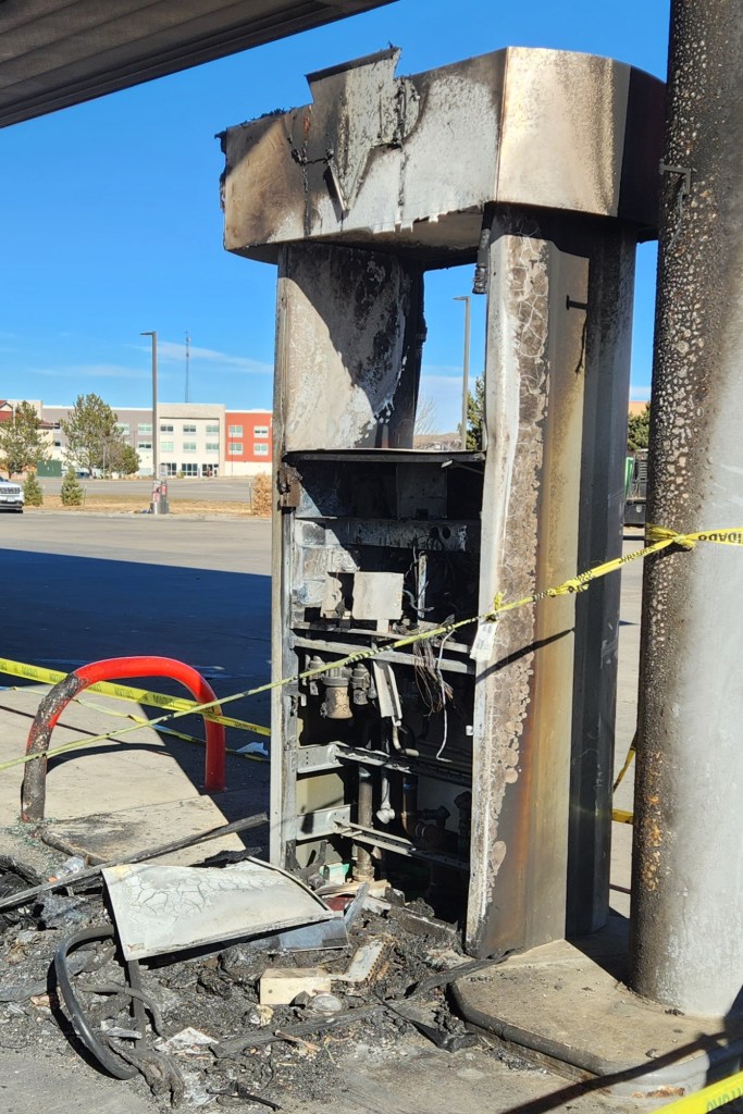 I’m posting a photograph of a burned gasoline pump. I don’t see how there could be any socially redeeming value to this post. It is just something to gawk at and ponder. This is a pump I have used for years. It’s like an old friend has perished.