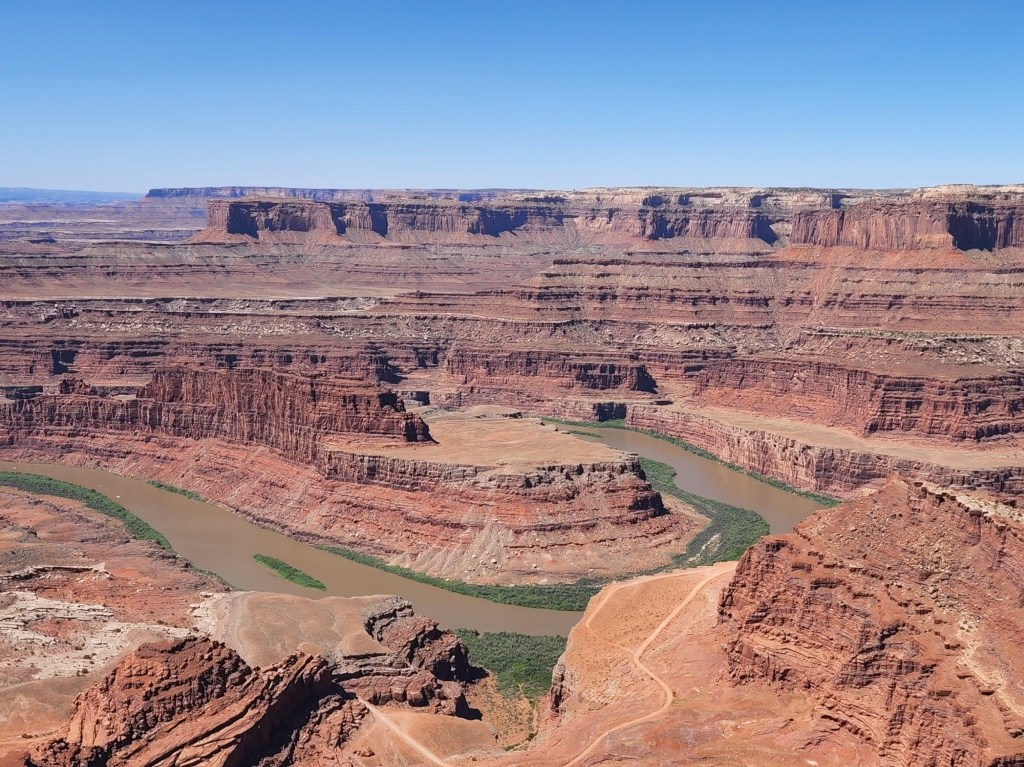 To the southwest a few miles is Dead Horse Point State Park. It has one main attraction which is a stunning overlook of the Colorado River and the northeast end of Canyonlands National Park. If you are in Moab it is worth a visit.