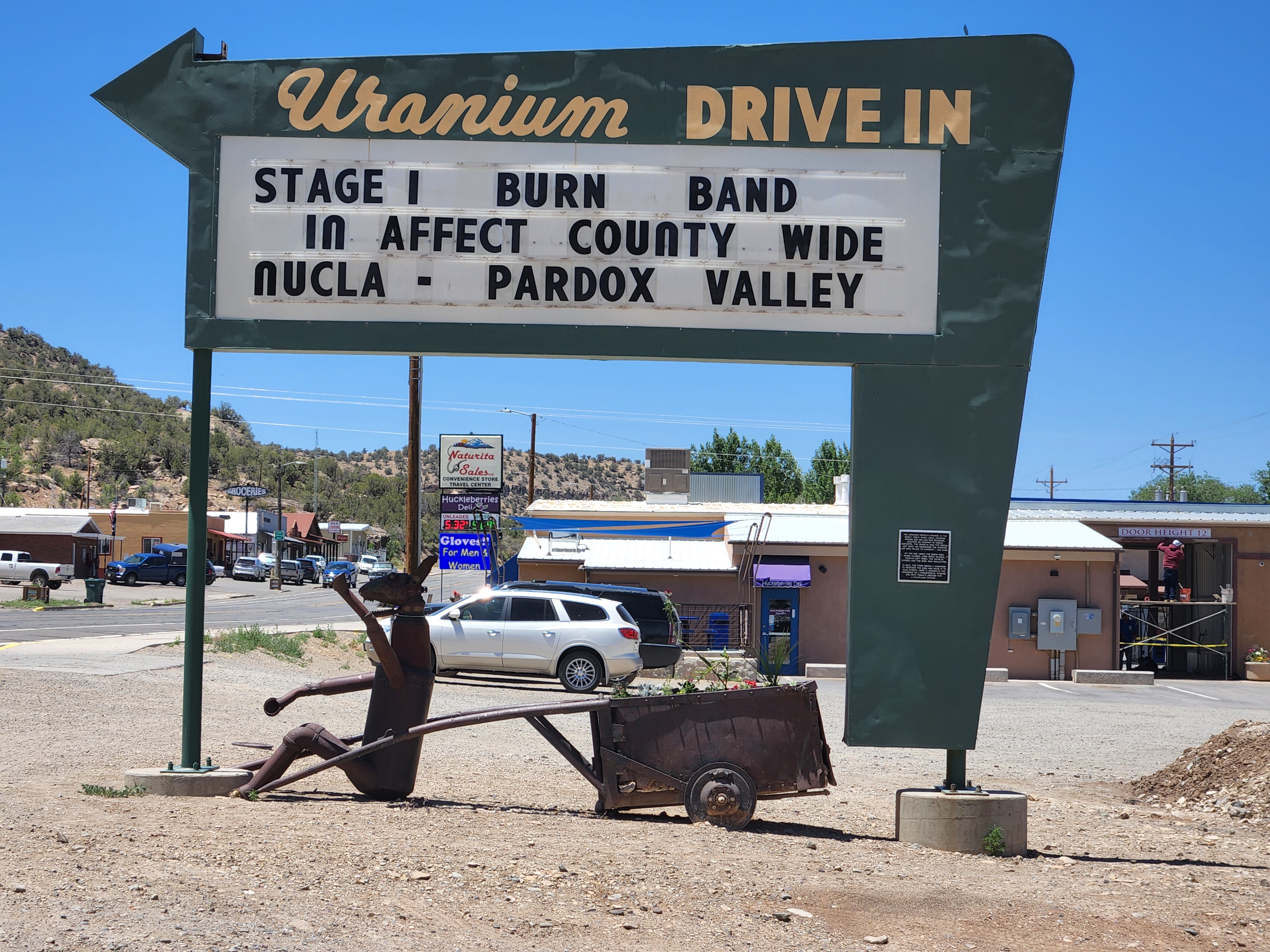 From Moab we traveled south and east across the La Sal Mountains and through the Paradox Valley in west central Colorado to visit Naturita and Uravan. Both are former uranium mill towns but Uravan is probably better known for it. The name comes from URAnium-VANadium ore found in the region. Moab also had a uranium boom and has a radioactive mill tailings legacy.
